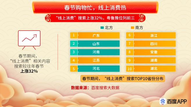 百度搜索大数据则显示,今年春节期间“线上消费”相关内容的搜索峰值较往年春节同期上涨32%。从地域分布来看,广东、山东、河南三省“线上消费”的搜索位列全国前三,南方人关注度超过北方人,2021牛年春节消费呈现出“开门红”的增长。