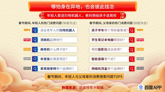具体的消费类别也百花齐放。百度搜索大数据显示,“适合老年人的扫地机器人”、“洗碗机品牌排行”、“麻将机什么牌子好?”等问题成为年轻人在春节期间热搜的消费问题,“孩子学车哪个驾校最靠谱?”、“学生笔记本电脑哪款好?”、“哪款投影仪适合家用?”等问题成为父母辈的关注焦点。