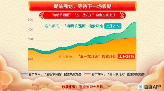 百度搜索大数据显示,春节期间,“清明节假期”相关内容的搜索热度环比上涨21%、“五一放几天”相关内容的搜索热度26%。随着疫情防控的良性发展,此后的小长假或将迎来新一轮的出行及返乡高峰。