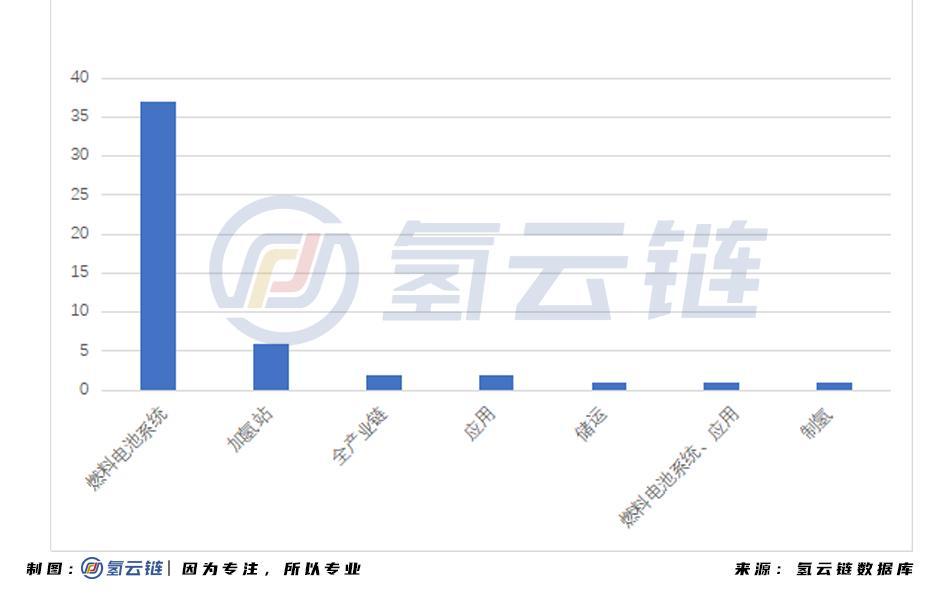 (1)资金分化向八个核心零部件头部企业聚拢。如下图所示,2020年燃料电池系统发生融资事件37起,加氢站领域融资事件6起,全产业链和应用环节各发生融资事件2起。