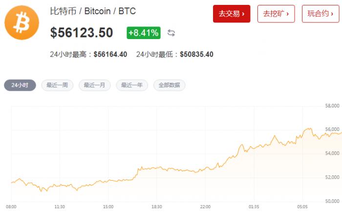 美股涨跌互现,区块链板块大涨,比特币一度突破56000美元