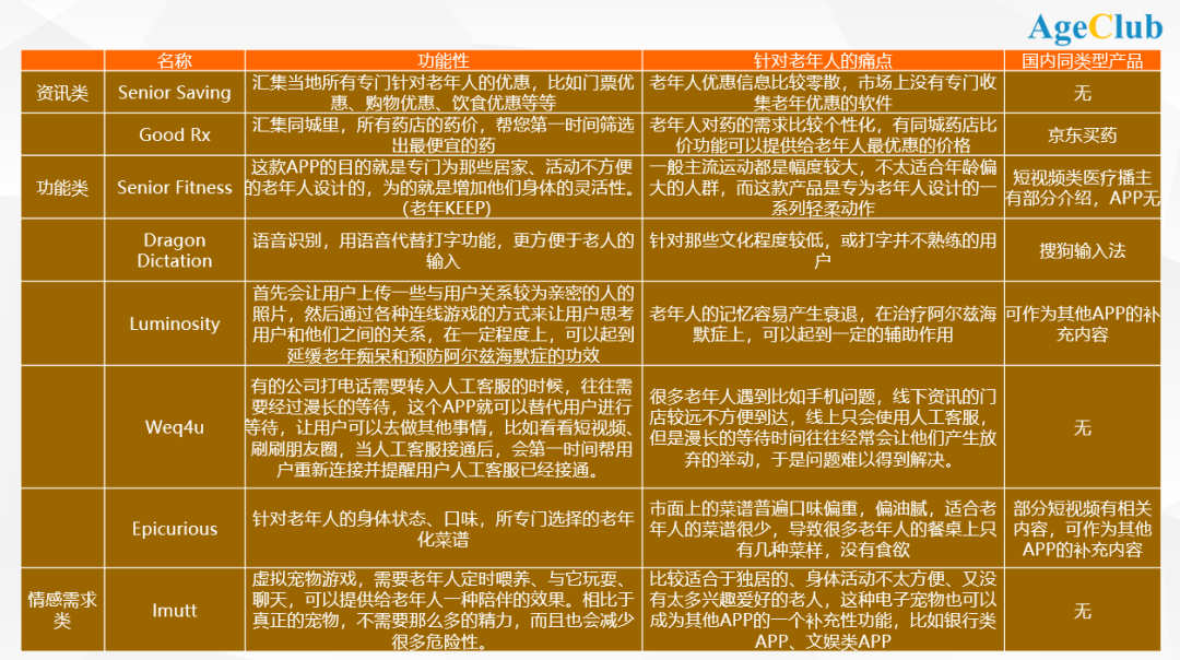 而本篇文章中,AgeClub主要搜集了国外专门针对中老年用户的APP,并结合中国的情况,从内容上提出更多的创业探索可能。