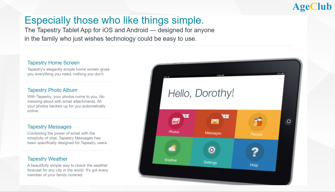 这一点在Tapestry上得到很好的体现,它的界面上仅仅只有:照片、信息、通讯录、天气、设置、帮助,这六个基本项——而这几项功能,对中老年而言,刚好满足他们的需求。