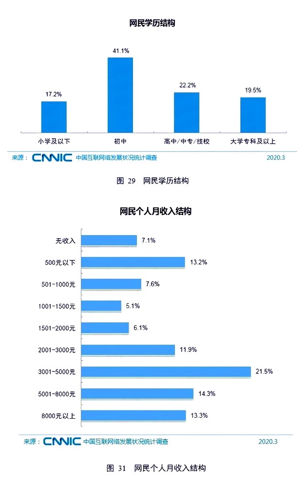第二个关键数据是收入,让“北上广”白领诧异的是,在大城市月薪2万被嘲为“赤贫”的今天,全国9.89亿网民中,月收入超过5000元的网民占比不到30%!。