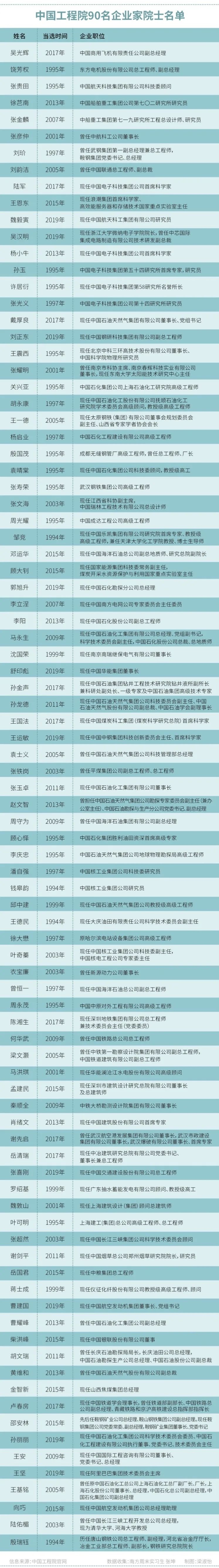 根据南方周末记者不完全统计,这900名院士名单中,有90名来自企业。他们历任、曾任、现任相关公司董事长、高级工程师等职务,包含航天、船舶、石油、科技、钢铁等领域。