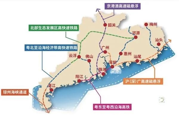 规划提出,围绕构建“一核一带一区”区域发展格局,建设上海-汕头-汕尾-深圳-广州(沪深广高速磁悬浮)、北京-韶关-广州-佛山-珠海-澳门(京港澳高速磁悬浮)的磁悬浮线路,还有阳江-珠海-深圳高铁(赣深客专西延线)、琼州海峡通道。