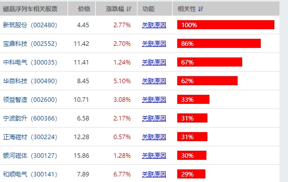 从磁悬浮概念股来看,据云财经的数据,如下股票跟磁悬浮的相关性最高。