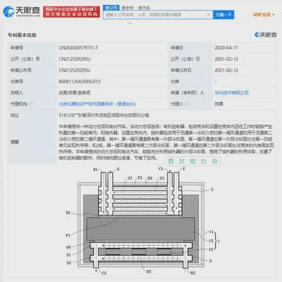 2月12日,华为公开一项名为“一种动力总成和电动汽车”的专利,公开号为CN212529295U,该专利申请时间为2020年4月17日。该专利摘要显示,本申请提供一种动力总成和电动汽车。本申请提供的动力总成和电动汽车,能够充分利用换热器的外部冷却面,提高了换热器的利用效率,改善了电机控制器的散热,同时结构更加紧凑,节省了空间。