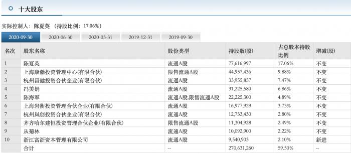 21世纪经济报道记者以目前的公开信息粗略推算,陈越孟(持股1.87%)及其一致行动人富浙资本(持股4.02%)、岚创投资(持股2.80%),加上2020年三季度末陈越孟控制的昌建投资(持股7.47%),四方合计持股16.16%,如果算上浙商汇悦持股1.07%,相关方合计持股达17.23%,陈越孟方面实质上成为上市公司第二大股东。