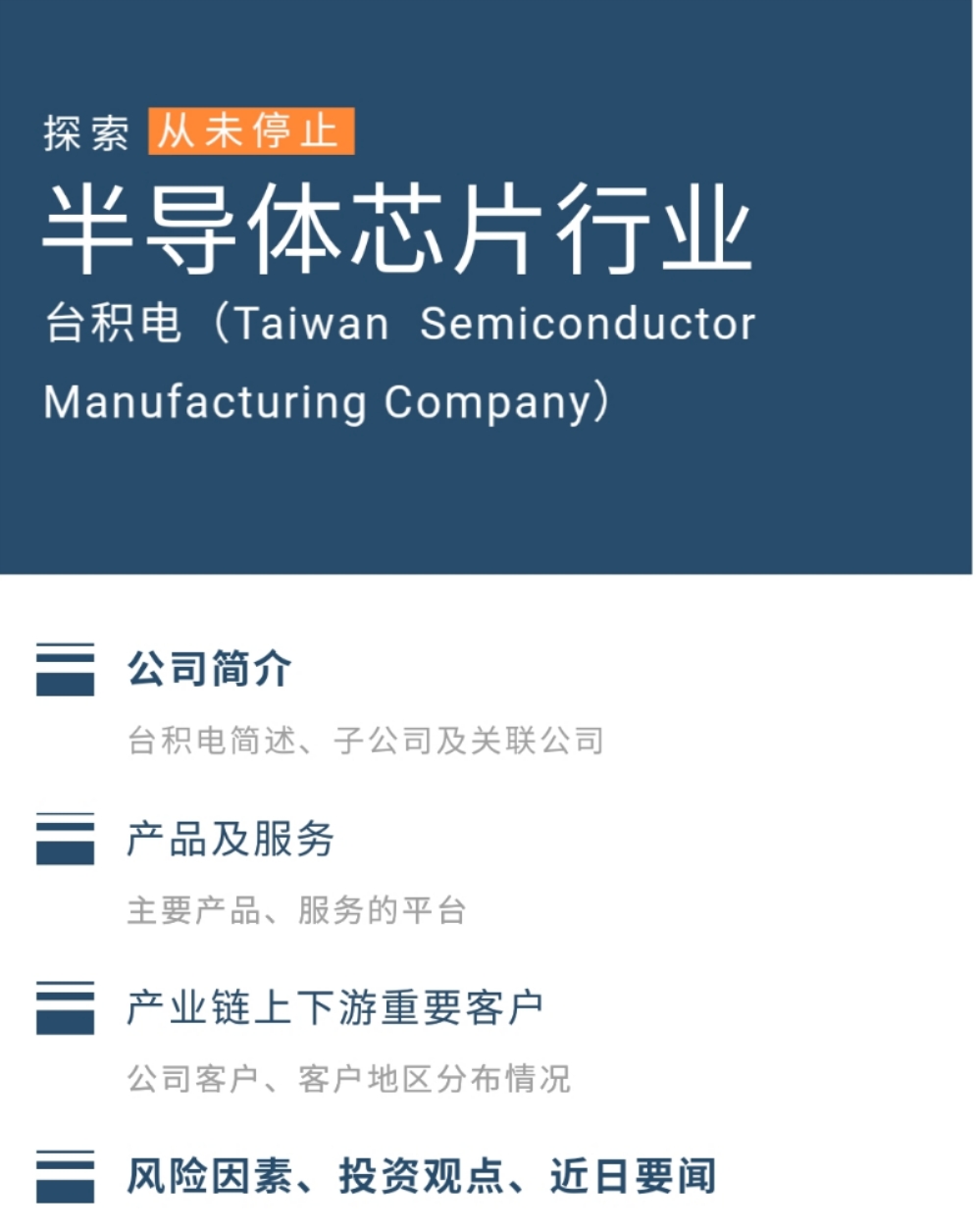 01 台积电简述台湾积体电路制造股份有限公司(美股代码:TSM),目前是半导体行业中全球最大的专用制造厂。成立于1987年,公司总部位于中国台湾新竹科学园。公司提供广泛的晶圆制造工艺,还提供设计、掩模制造、凸点、先进封装和测试服务。