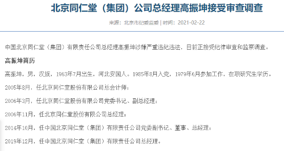 2月22日,据北京市纪委监委消息:北京同仁堂(集团)有限责任公司总经理高振坤涉嫌严重违纪违法,目前正接受纪律审查和监察调查。