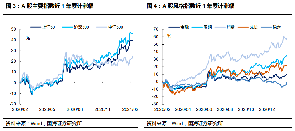 近期 A 股指数全线上涨。本周五(2 月 19 日),相较于上上周五(2 月 5 日),上证 50 指数收于 4014,上涨 4.52%;沪深 300 指数收于 5779,上涨 5.39%;中证 500 指数收于 6703,上涨 7.43%。