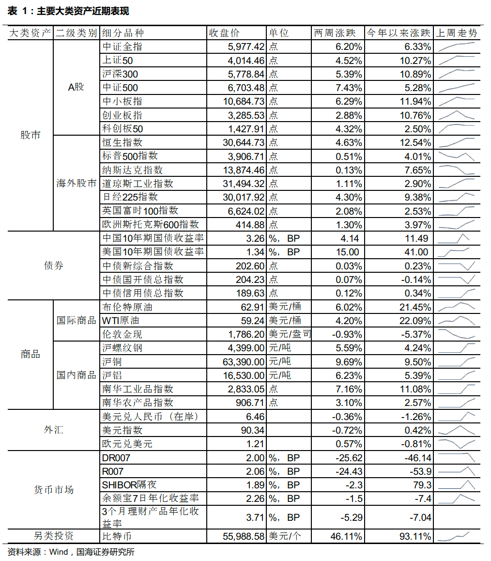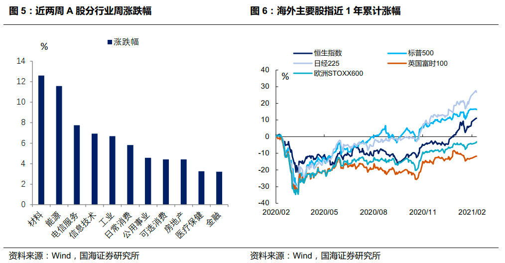 10 年期美债收益率上行。本周五(2 月 19 日),相较于上上周五(2 月 5 日),10 年期美债收益率为 1.34%,上行 15BP;本周四(2 月 18 日),日本 10 年期国债收益率为 0.10%,上行 3.8BP;德国 10 年期国债收益率为-0.38%,上行10BP。