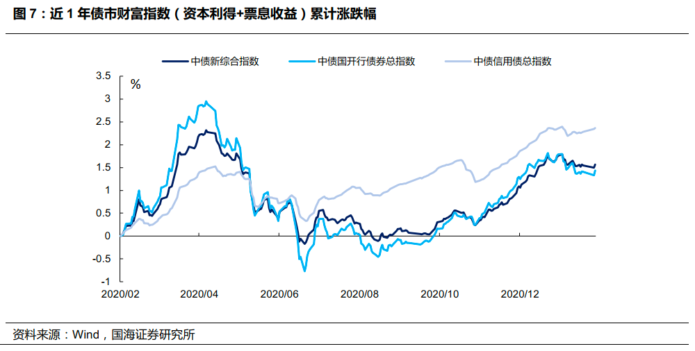 近期债市回报(资本利得+票息收益)为正,信用债表现整体优于利率债。本周五(2月19日),相较于上上周五(2月5日),中债新综合财富指数上涨0.03%;中债国开债财富指数上涨0.07%;中债信用债财富指数上涨0.12%。