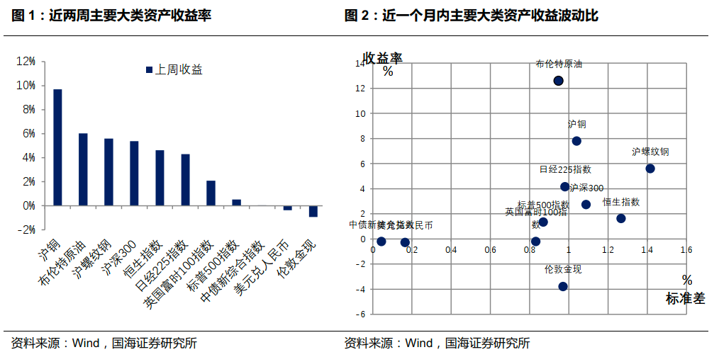 近期主要大类资产中,沪铜涨幅最大,伦敦金现表现最差。本周五(2 月 19 日),相较于上上周五(2 月 5 日),沪铜涨幅排名第一,涨幅为 9.69%。布伦特原油涨幅排名第二,涨幅为 6.02%。伦敦金现表现不佳,跌幅 0.93%,收益率排名垫底。近期主要国家股市普遍上涨,近一个月来布伦特原油波动收益比表现较好。