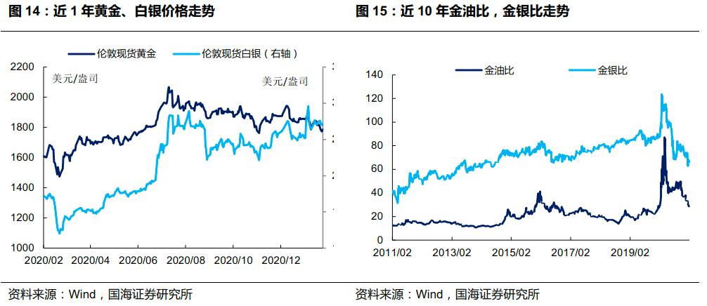 近期黄金价格小幅下跌、白银价格小幅上涨。本周五(2 月 19 日),相较于上上周五(2 月 5 日),伦敦现货黄金价格为 1786.20 美元/盎司,下跌 0.93%;伦敦现货白银价格为 26.95 美元/盎司,上涨 1.58%;金油比为 28.39,下行 1.99;金银比为 66.28,下行 1.68。