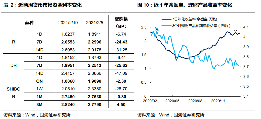资金面略有宽松。本周五(2 月 19 日),相较于上上周五(2 月 5 日),银行间 7天质押回购利率为 2.0553%,下行 24.43BP;银存间 7 天质押回购利率为1.9951%,下行 25.62BP;SHIBOR 隔夜为 1.8860%,下行 2.30BP。