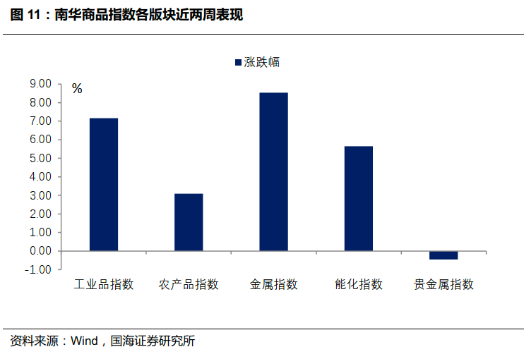 商品市场中,近期金属指数涨幅最大,贵金属指数涨幅表现最差。本周五(2月19日),相较于上上周五(2月5日),南华工业品指数上涨7.16%,农 产品指数上涨3.10%,金属指数上涨8.53%,能化指数上涨5.64%,贵金属指数下跌0.45%。