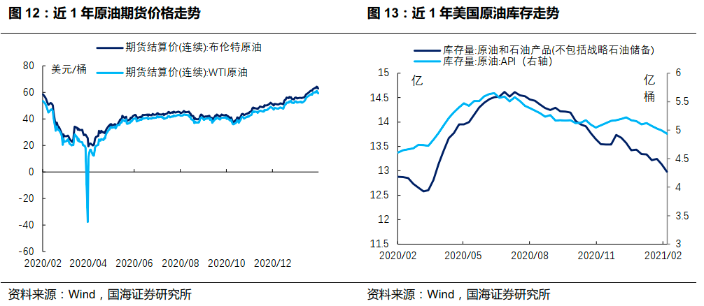 近期国际原油价格大涨,上周美国原油库存下跌。本周五(2 月 19 日),相较于上上周五(2 月 5 日),布伦特原油期货结算价收于 62.91 美元/桶,上涨 6.02%;WTI 原油期货结算价收于 59.24 美元/桶,上涨 4.20%;上周五(2 月 12 日),相较于 2 月 5 日,美国 EIA 原油库存环比下跌 1505.30 万桶。