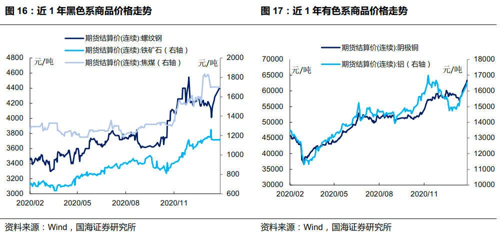 近期黑色系商品和有色系商品涨跌不一。本周五(2 月 19 日),相较于上上周五(2 月 5 日),螺纹钢收于 4399 元/吨,上涨 5.59%;铁矿石收于 1160 元/吨,上涨 0.43%,焦煤收于 1696 元/吨,下跌 0.24%。沪铜收于 63390 元/吨,上涨9.69%;沪铝收于 16530 元/吨,上涨 6.23%。