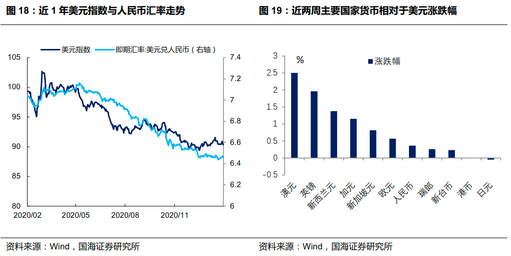 近期美元指数小幅下跌,人民币小幅升值。本周五(2 月 19 日),相较于上上周五(2 月 5 日),美元指数收于 90.34,下跌 0.72%;人民币兑美元汇率为 6.46,下行 0.36%。