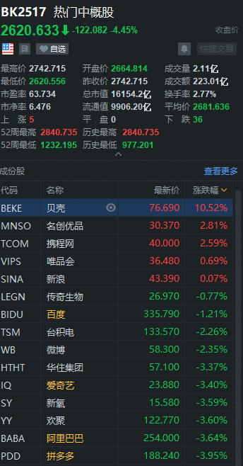 知名中概股中:哔哩哔哩跌约10%,京东跌近8%,腾讯ADR跌超5%,阿里巴巴跌超3%。