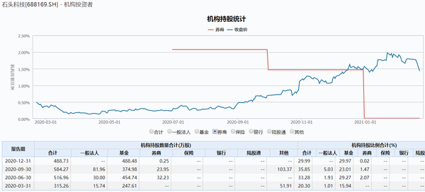 Wind显示,2020年二季度末、三季度末和四季度末,券商持股数量分别为32.23万股、23.95万股和0.25万股,持股比例骤降至0.02%。