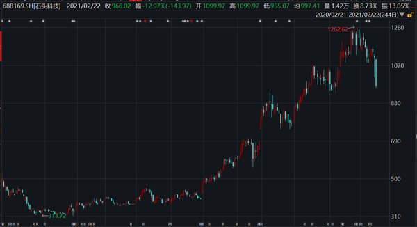 一边是价值317亿元(2月19日市值)的解禁潮来袭,一边是重磅推出的82亿元减持计划。受此影响,2月22日,石头科技股价开盘后40分钟一路走低并跌破千元关口,最终报收于966.02元,全天跌幅达12.97%,市值蒸发95.96亿元至644亿元,较52周高点已下挫23.49%。