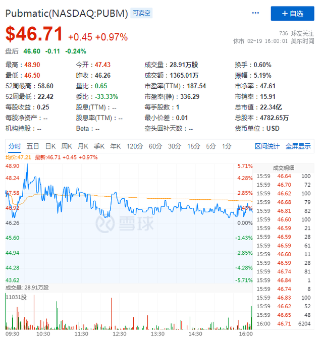 PubMatic于去年12月在美国纳斯达克上市,发行590万股,发行价为20美元,募资总额为1.18亿美元。自上市以来,PubMatic股价上涨超过170%,市值为26.53亿美元。