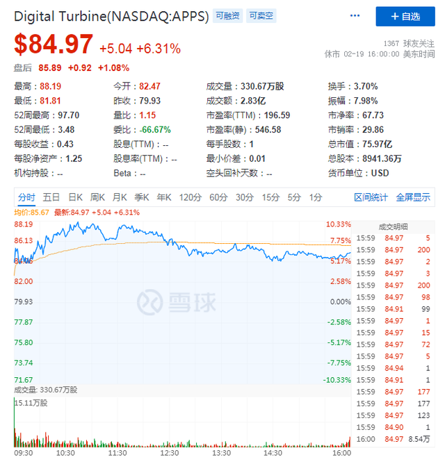 该公司还提供程序化广告和有针对性的媒体交付服务;和其他产品和专业服务直接相关的核心平台。在短短的一年里,Digital Turbine股价从 4 美元疯长到现在的 80 多 美元,截至目前,其市值为78.76亿美元。