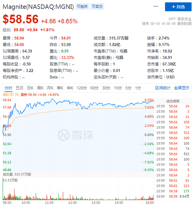 据悉Magnite是一家在美国和国际上运营独立的卖方广告平台,其全渠道广告平台使发布商能够利用各种拍卖类型和格式(包括CTV,台式显示器,视频,音频和移动设备)获利,并允许代理商和品牌访问品牌安全的广告资源并执行广告交易。去年以来,该股全年上涨超400%,市值为61.52亿美元。
