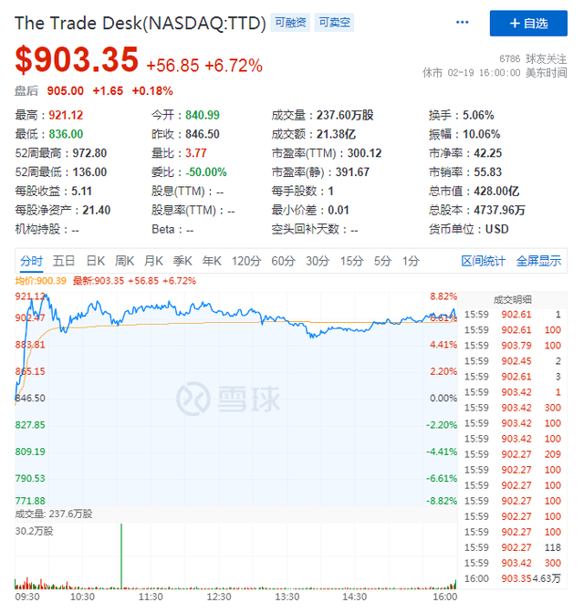 基于The Trade Desk的竞争优势,这也让它的股价上涨明显。去年一年,The Trade Desk股价涨幅超200亿美元。截至目前,该公司市值为401.57亿美元。