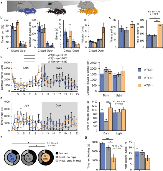 通常,发育中的小鼠仅表达母亲的Phlda2拷贝,以防止这些胎盘激素泛滥。使父亲的副本沉默会有效地使基因指令的输出减半。John的研究小组通过基因操纵小鼠胚胎,产生三种不同剂量母体表达的Phlda2的后代基因(两个活跃的等位基因,一个活跃的等位基因(现存状态)和功能丧失),以期发现孕期母体下丘脑和海马体的变化。结果显示,"父系化 "的母体暴露在最低的Phlda2剂量下,表现出增加了对幼仔的抚育,增加了自我指导行为,减少了对巢穴建设的关注。