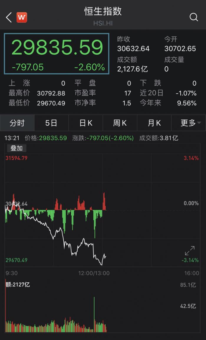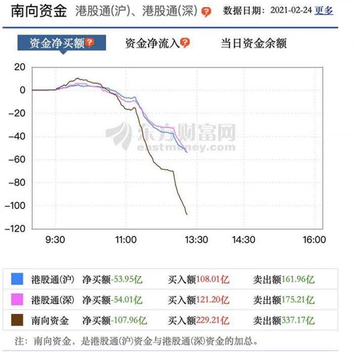 2月24日,恒生指数午后开盘快速走低,跌幅扩大至2.6%。香港交易所一度跌超12%,恒生科技指数跌近5%。截至发稿,南向资金午后净卖出达100亿元。