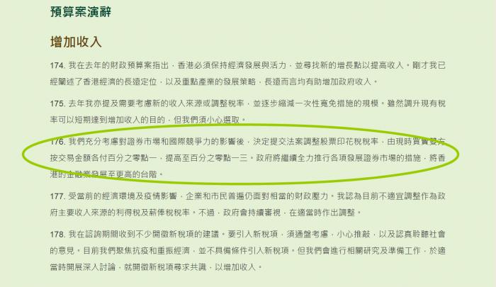 香港政府公布的财政预算案文字版提到了这一点,提高股票交易印花税的目的在于帮助增加政府收入: