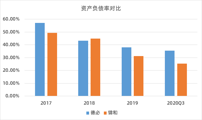 因采取轻资产的模式运行,德必与锦和商业的资产负债率均较低,自2017年以来,一直维持在60%以下,从趋势来看,均处于持续的下降中。2019年末,德必的资产负债率为38.08%,锦和商业的资产负债率为31.2%,且在2020年,二者均有所下降。