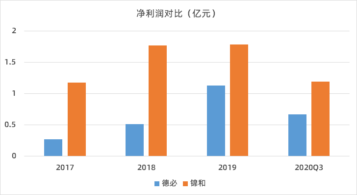 在2017年至2020年前三季度,德必分别实现净利润约为0.27亿元、0.51亿元、1.13亿元、0.67亿元。同期,锦和商业净利润分别为1.18亿元、1.77亿元、1.79亿元、1.19亿元。
