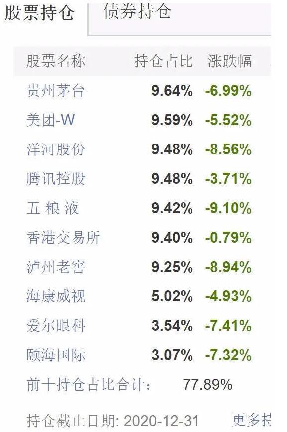 以张坤的易方达蓝筹精选为例,该基金去年四季度前十大重仓股分别为:贵州茅台、美团-W、洋河股份、腾讯控股、五粮液、香港交易所、泸州老窖、海康威视、爱尔眼科、颐海国际。