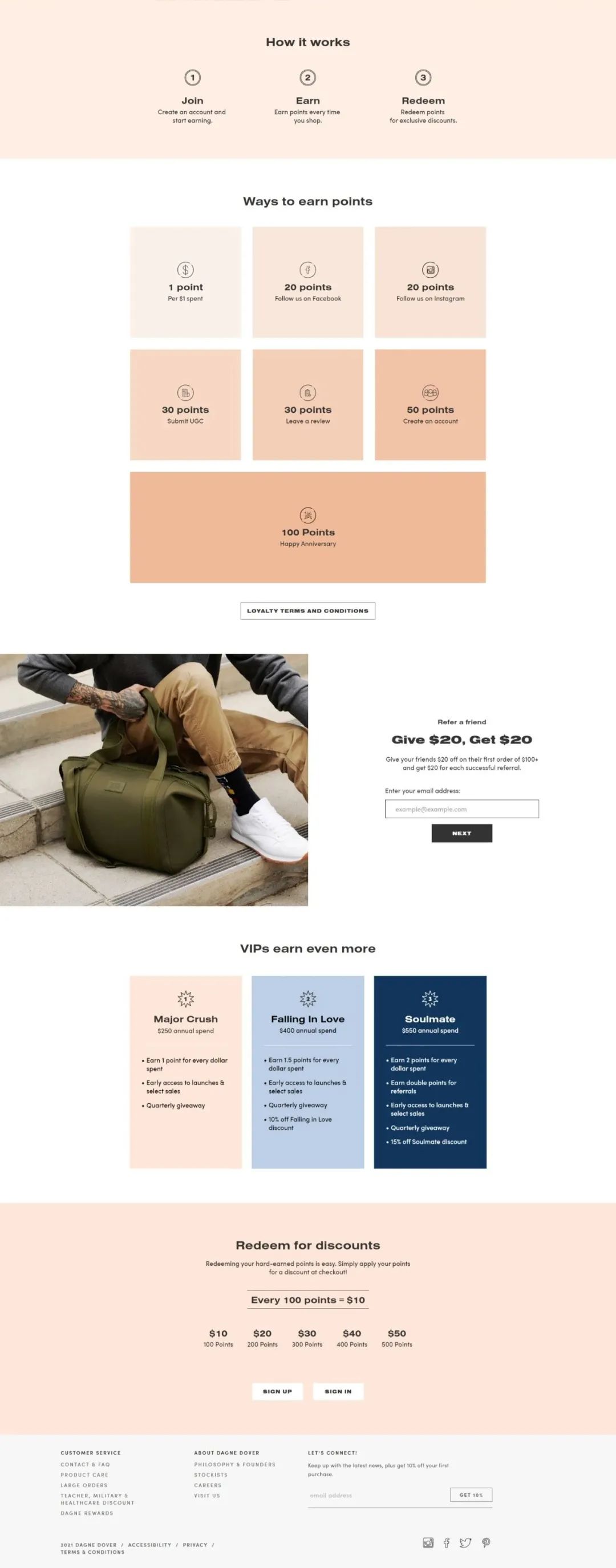 Dagne Dover的会员体系是这样的,如果消费者关注它的Instagram,就可以得到20积分;如果为商品撰写评论或者提供一些原创内容(即UGC),则获得30积分。