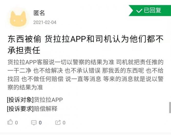 多名用户反映货拉拉司机和平台互相推诿责任 图源 记者截图