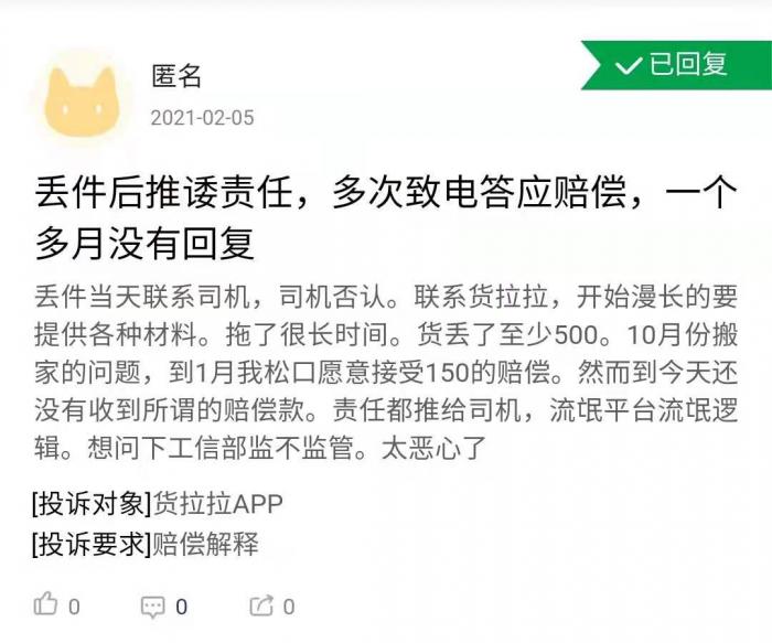 值得注意的是,多条投诉提及货拉拉存在司机与平台相互推诿责任的问题,尤其是在出现货物丢失以后,多个用户反映货拉拉平台和司机都不愿承担相应责任,处理过程漫长。