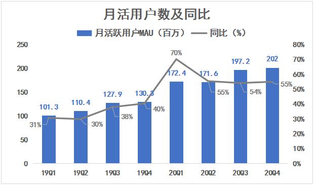 先来看B站的月活跃用户数情况,由上图可以看到,四季度,B站的月活跃用户数(MAU)为2.02亿,作为流量黑马,B站MAU突破2亿,同比增长55%,增速基本与上两个季度持平;环比来看,B站的MAU增长了2%。