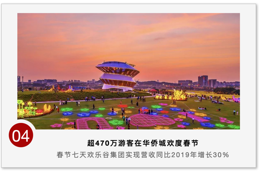 超470万游客在华侨城欢度春节,春节七天欢乐谷集团实现营收同比2019年增长30%。华侨城华南集团副总裁冯晖告诉新旅界,华侨城顺德欢乐海岸PLUS今年春节总客流790947人次,环比国庆增长22%。杭州开元森泊度假乐园春节营收比开元森泊旅游投资公司总经理叶建平1月底预想的“能达到2019年春节50%就算很好”要强得多,最终营收比2019年增长35%,入住率达70%。
