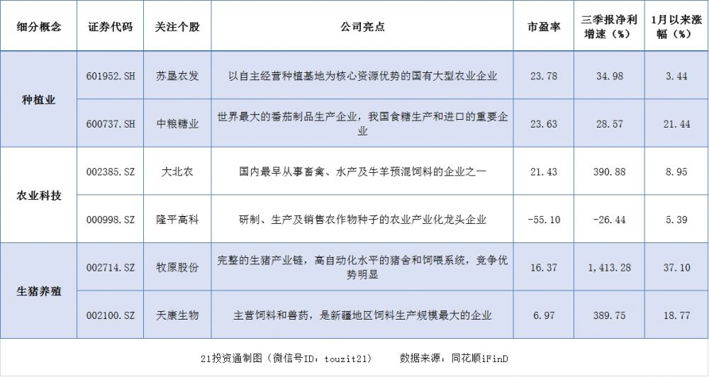 种植业、农业科技、生猪养殖受重点关注