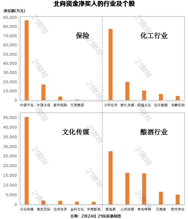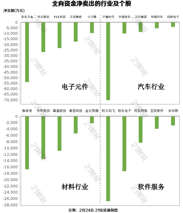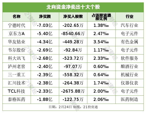 据21投资通(微信号ID:touzit21)智能监测,2月24日,北向资金净卖出6.73亿元,其中沪股通净卖出1.44亿元,深股通净卖出5.29亿元。