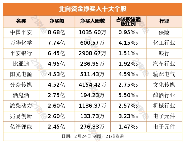 个股方面,北向资金净买入中国平安(601318.SH)、万华化学(600309.SH)、平安银行(000001.SZ)、比亚迪(002594.SZ)、阳光电源(300274.SZ)居前,其中,中国平安被净买入8.68亿元,万华化学被净买入7.74亿元,平安银行被净买入6.45亿元,比亚迪被净买入4.95亿元,阳光电源被净买入4.53亿元。