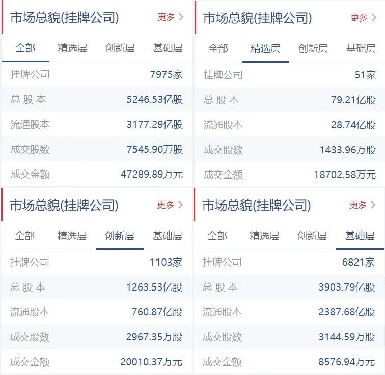新三板挂牌公司总计7975家(精选层51家,创新层1103家,基础层6821家),总股本5246.53亿股,流通股本3177.29亿股。