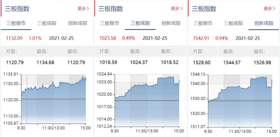 截至2月25日收盘,三板做市报1132.09点,上涨1.01%;三板成指报1023.58点,上涨0.49%;三板创新成指报1542.91点,上涨0.94%。