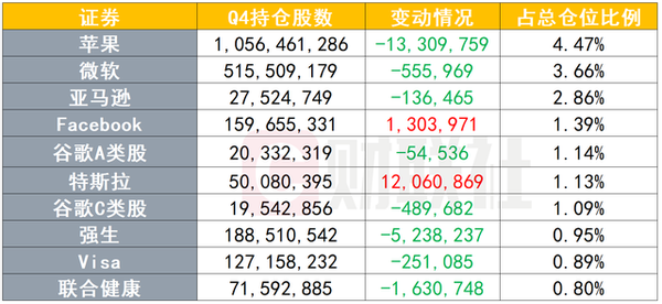 其中,苹果位列第一,持仓约10.56亿股,持仓市值约1401.81亿美元;微软紧随其后,持仓约5.16亿股,持仓市值约1146.6亿美元;亚马逊排在第三,持仓约2752.47万股,持仓市值约896.46亿美元;此外,特斯拉是第六大重仓股,持仓市值约353.4亿美元,较上季度持仓数量增长了31%,符合其称碳中和目标将改变全球资产配置格局的表态。