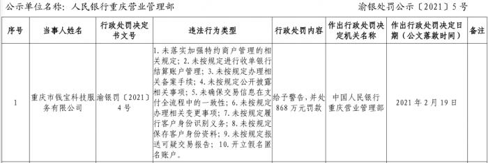 2月24日,央行重庆营业管理部发布的一则行政处罚信息显示,重庆市钱宝科技服务有限公司(下称“钱宝科技”)因开立假名匿名账户等十项违法行为,遭到央行重庆营业管理部警告,并被罚款868 万元。